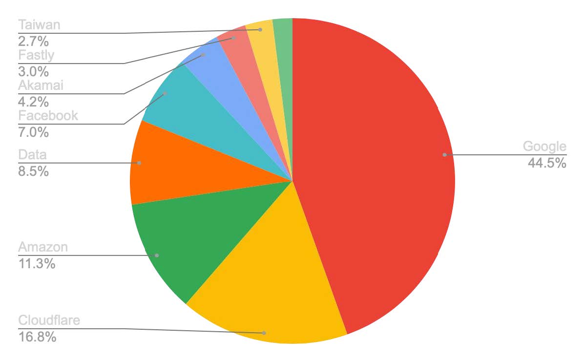 如果將所有 request 根據 ASN 進行統計排序,我們發現網站依賴資源高度集中於大型供應商,其中超過 5% 的來源有 Google、Cloudflare、Amazon、中華電信及 Facebook。